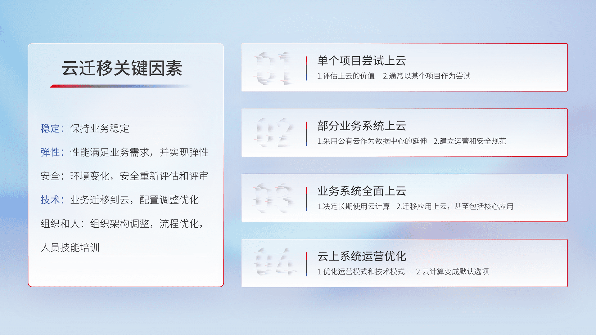 结合实际业务,,,,从规划设计、、云平台选型、、、、云原生改造、、、数据迁移、、、集成交付,,迁移全过程为客户识别最佳上云路径,,做好风险识别管理,,,设计网络架构、、、身份权限、、、安全审计合规、、操作审计、、日志审计、、、、监控告警策略、、多站点容灾设计等,,,,对云上基础设施进行整体规划,,提升IT治理水平,,以满足弹性、、高可用、、高性能的需求。。