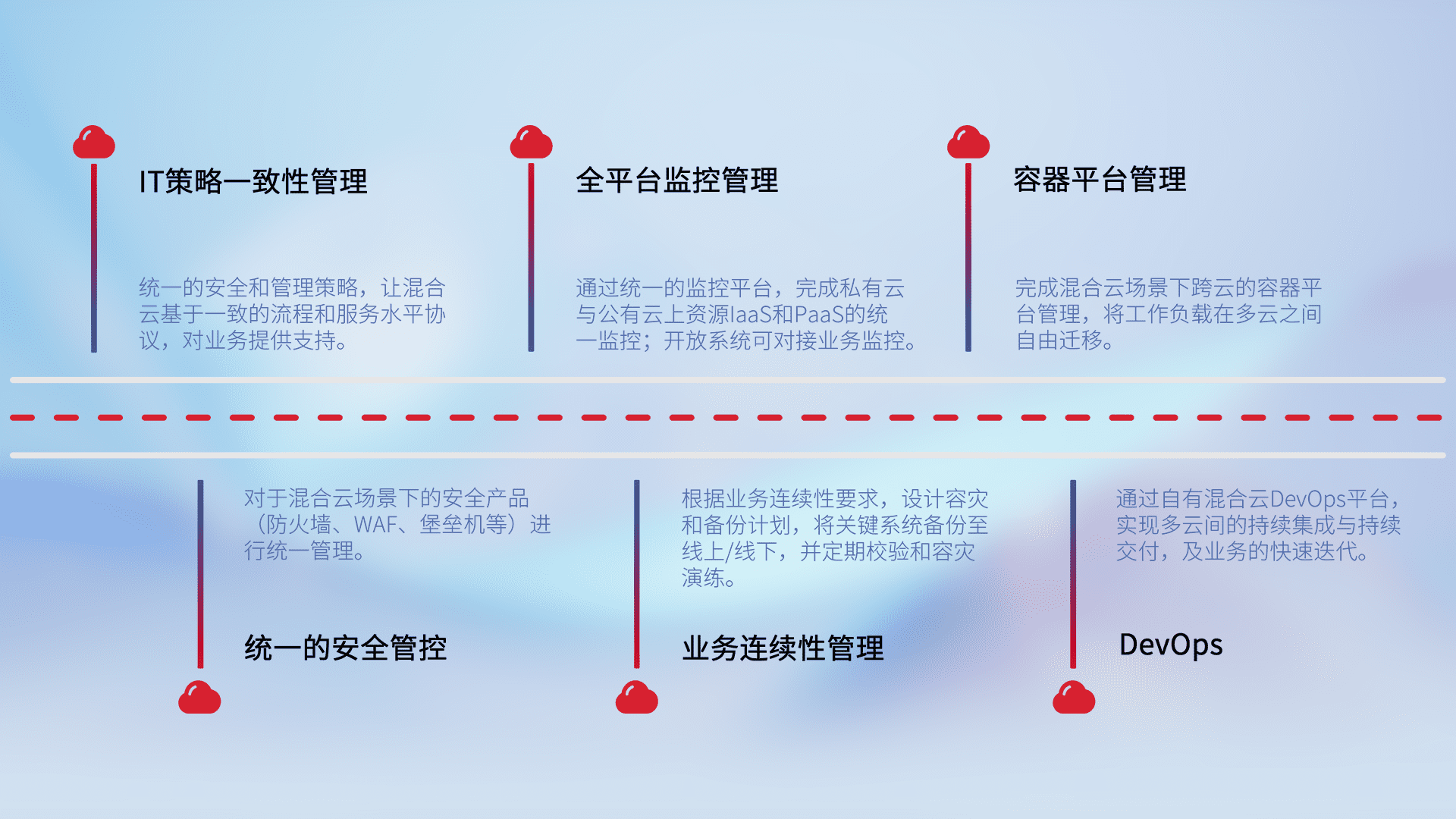 通过多云纳管,,,以统一的资源数据模型把客户的云资源进行抽象和封装,,,,进而实现对多云资源的统一操作,,保障云资源管理的可靠性、、稳定性与可用性。。。。量身定制化运维内容,,,,配置、、、、开发运维、、补丁管理、、、、备份、、、、监控、、认证和访问管理、、、审计和日常巡检等,,,保障在用云过程中的可靠度,,,,稳定度以及高可用率。。